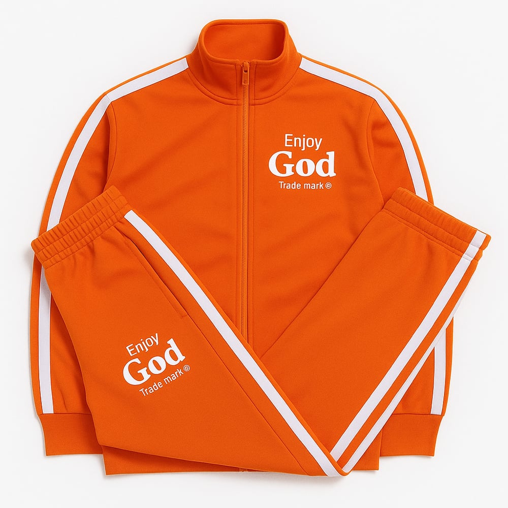 Premium cut & sew tracksuit with our classic "Enjoy God" logo printed on jacket and pants. Represent God without saying a word!